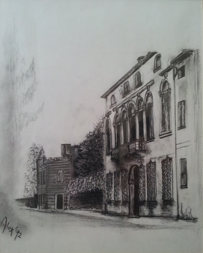 Nelle immagini: la pittrice Alessia Prearo e "Villa Marchiori a Lendinara" - matita a carboncino (1992)